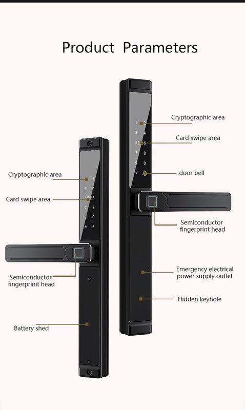 | Unlock Methods | Tuya/TTlock, Password, Fingerprint, Card, Key, USB port |
