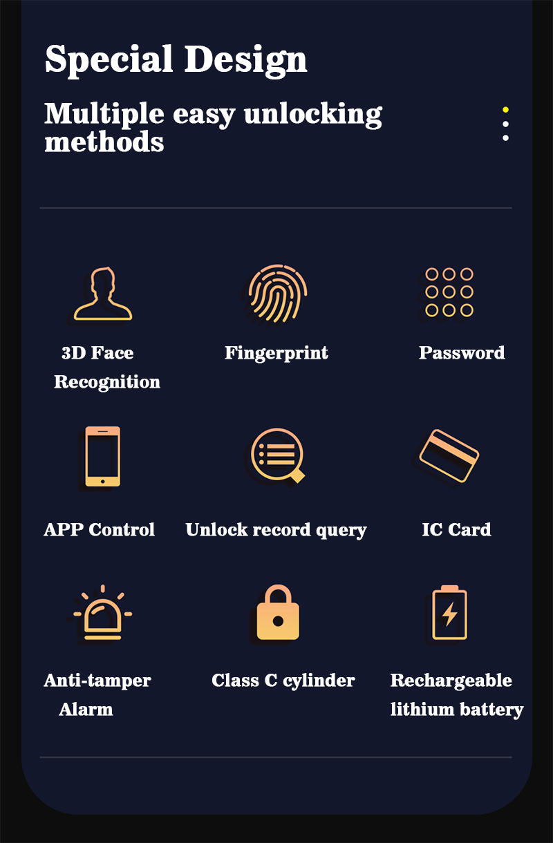 | Unlock Methods | Tuya WiFi app, Password, Fingerprint, Card, Key |
