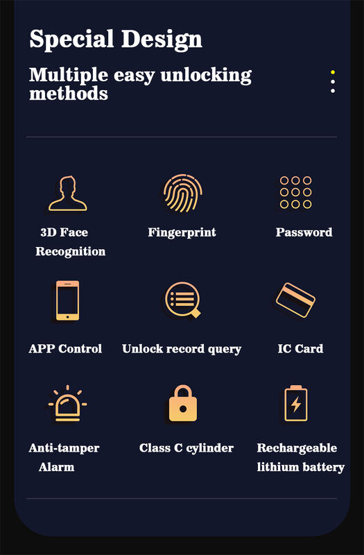 | Unlock Methods | Tuya WiFi app, Password, Fingerprint, Card, Key |